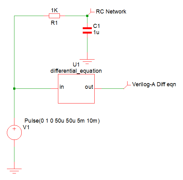 'include "disciplines.vams" module differential_equation(in, out) ; electrical in, out; analog begin V(out) : ddt(V(out)) == (V(in) - V(out))/1m ; end endmodule