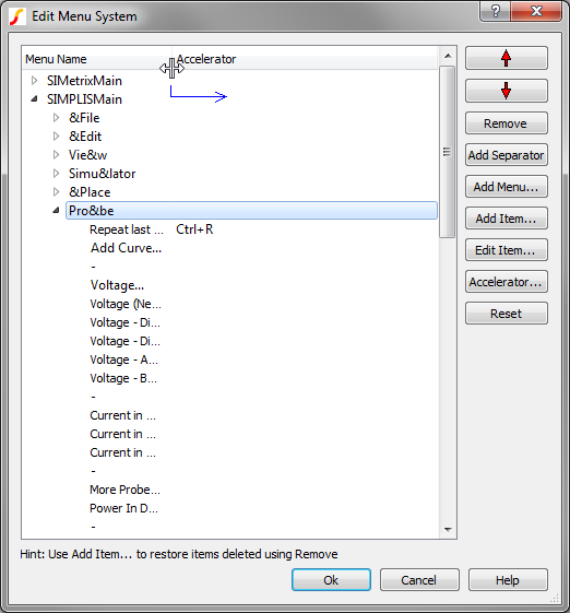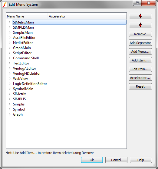 Every menu item and keyboard shortcut is implemented with the SIMetrix/SIMPLIS script language. The menus you see on the different windows are not a permanent part of the program but are created from scratch every time the program starts. This gives you a great deal of flexibility to add new menu items as well as moving or deleting existing menu items.