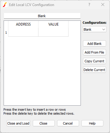 The Local LCV Block is a symbol that can be placed on a schematic and can hold multiple LCV configurations. Each configuration can be viewed, edited, saved, and/or loaded via the symbol's dialog: